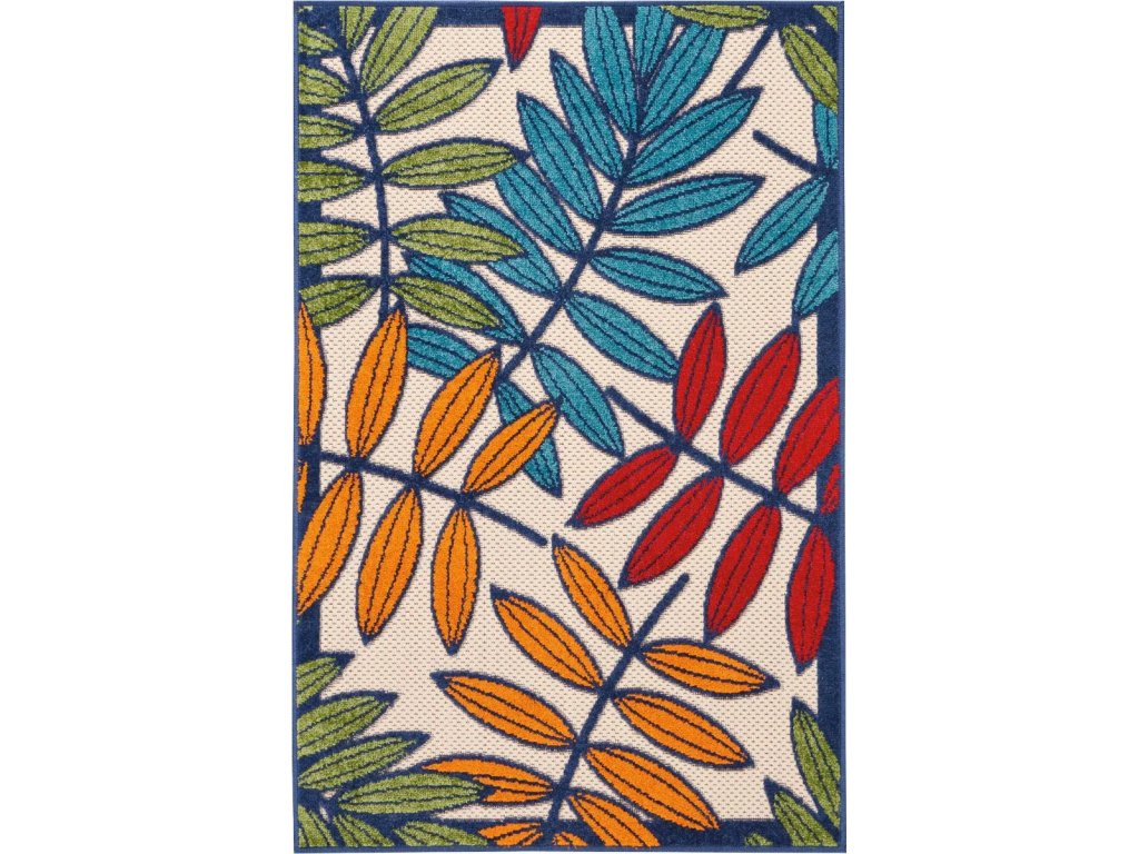 Product Description A cheerful and charming oversized leaf design is a fun, flirty, and fashionable way to uplift any environment, especially when presented in energetic hues of red, orange, green, and blue. This Aloha indoor/outdoor area rug from Nourison is created from premium stain-resistant fibers for long wear, low maintenance, and a splendid texture.