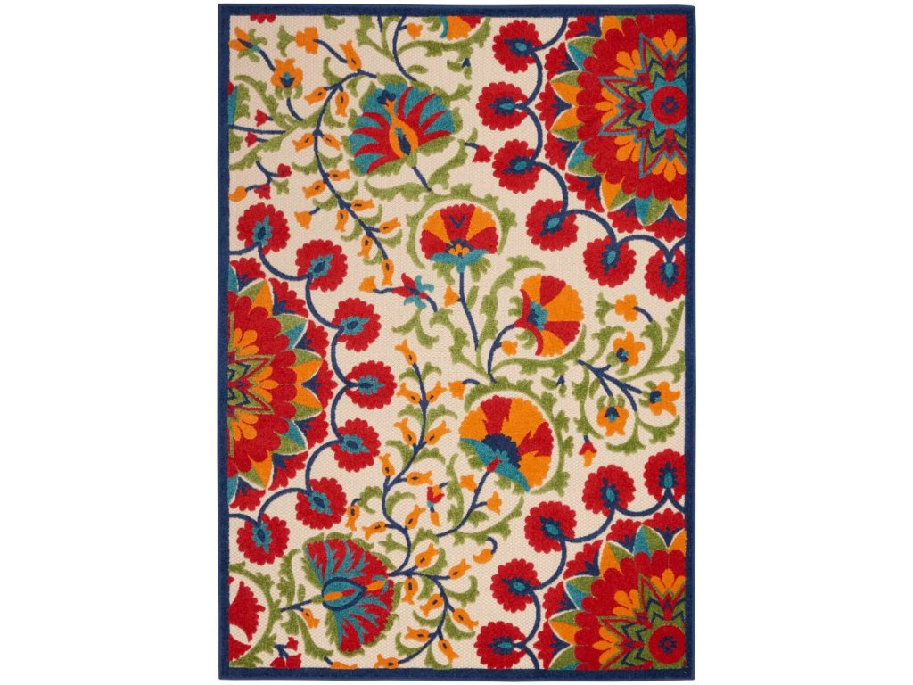 Product Description This indoor/outdoor rug from the Aloha Collection features soft cut pile and textural woven patterns in bursts of color sure to enliven any space, both inside and outside your home. Twisting vines and blooms in red and orange multicolor add a festive floral touch to your patio or deck. Created from premium stain-resistant fibers for long wear, low maintenance, and a splendid texture.