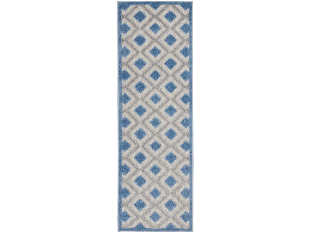 Product Description Introduce texture and pattern to your porch or deck with ease with this indoor/outdoor rug from the Aloha Collection. Simple in its sophistication, it features an all-over concentric diamond motif with a simple border in grey, blue, and ivory tones that work beautifully in modern and contemporary settings. Premium, stain resistant fibers offer durability and ease of cleaning just rinse with a hose and air dry!