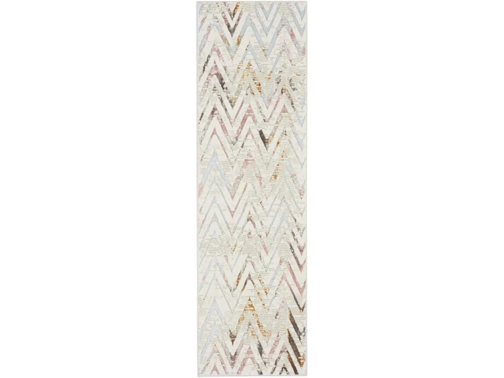 Product Description: The classic chevron pattern gets a modern update with this contemporary rug from the Glitz Collection. The geometric design is presented in soft multicolored shades with a subtly distressed finish and shimmering accents that shift under different lighting. Made from softly textured, easy to clean polyester yarns.